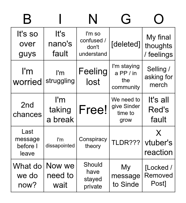 This bingo card has a free space and 24 words: I'm dissapointed, Now we need to wait, Feeling lost, What do we do now?, My final thoughts / feelings, It's so over guys, I'm worried, It's nano's fault, We need to give Sinder time to grow, Conspiracy theory, I'm staying a PP / in the community, 2nd chances, TLDR???, X vtuber's reaction, I'm struggling, My message to Sinde, It's all Red's fault, I'm so confused / don't understand, Selling / asking for merch, I'm taking a break, [Locked / Removed Post], Last message before I leave, [deleted] and Should have stayed private.