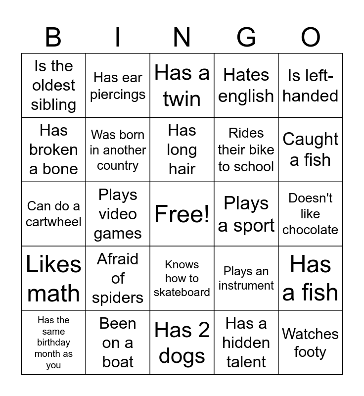 This bingo card has a free space and 24 words: Afraid of spiders, Been on a boat, Has long hair, Has the same birthday month as you, Is left-handed, Is the oldest sibling, Has broken a bone, Has ear piercings, Plays a sport, Knows how to skateboard, Rides their bike to school, Can do a cartwheel, Plays an instrument, Has a fish, Was born in another country, Has a hidden talent, Doesn't like chocolate, Has a twin, Caught a fish, Plays video games, Watches footy, Likes math, Hates english and Has 2 dogs.