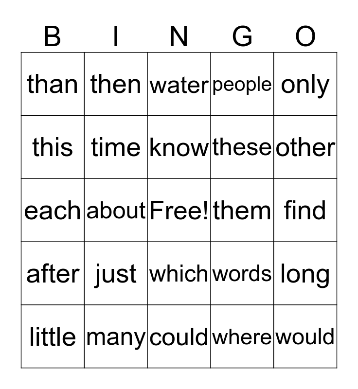 This bingo card has a free space and 24 words: just, many, know, little, only, than, this, then, them, which, these, each, words, long, time, where, find, water, other, about, would, after, people and could.