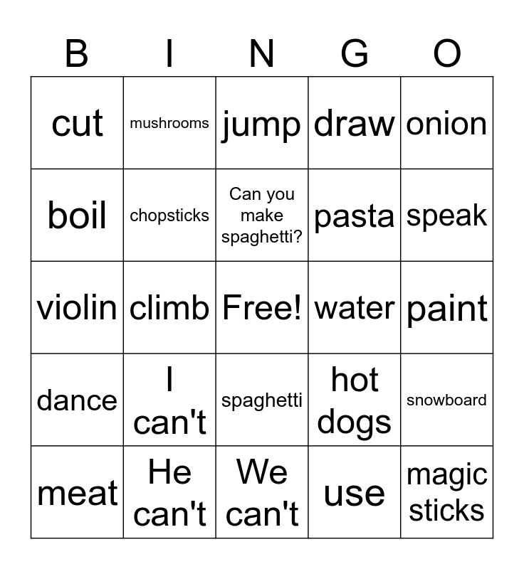 This bingo card has a free space and 24 words: I can't, He can't, Can you make spaghetti?, meat, onion, cut, boil, mushrooms, water, spaghetti, pasta, violin, hot dogs, snowboard, chopsticks, use, paint, jump, speak, climb, magic sticks, dance, draw and We can't.