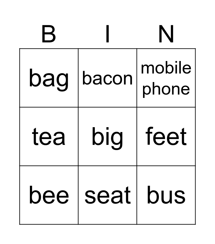 This bingo card has 20 words: Free!, o, mobile phone, coat, home, big, book, bag, bus, bacon, bank, jeep, feet, reed, bee, leaf, seat, tea, pea and bed.