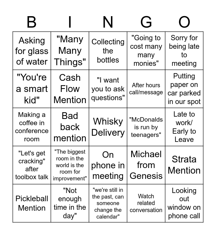 This bingo card has a free space and 24 words: "The biggest room in the world is the room for improvement", "Not enough time in the day", "I want you to ask questions", Pickleball Mention, Sorry for being late to meeting, Asking for glass of water, "You're a smart kid", "Many Many Things", "McDonalds is run by teenagers", On phone in meeting, After hours call/message, Making a coffee in conference room, Michael from Genesis, Strata Mention, Cash Flow Mention, Watch related conversation, Late to work/ Early to Leave, Collecting the bottles, Putting paper on car parked in our spot, Bad back mention, Looking out window on phone call, "Let's get cracking" after toolbox talk, "Going to cost many many monies" and "we're still in the past, can someone change the calendar".