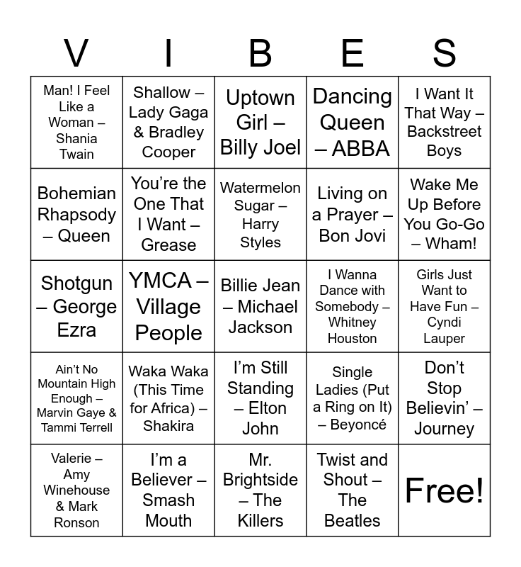 This bingo card has 34 words: Free!, Twist and Shout – The Beatles, Brown Eyed Girl – Van Morrison, Build Me Up Buttercup – The Foundations, Ain’t No Mountain High Enough – Marvin Gaye & Tammi Terrell, You’re the One That I Want – Grease, I Want It That Way – Backstreet Boys, Valerie – Amy Winehouse & Mark Ronson, Shallow – Lady Gaga & Bradley Cooper, Hey Jude – The Beatles, Watermelon Sugar – Harry Styles, Uptown Girl – Billy Joel, Roar – Katy Perry, Footloose – Kenny Loggins, I Wanna Dance with Somebody – Whitney Houston, Wake Me Up Before You Go-Go – Wham!, I’m a Believer – Smash Mouth, Shotgun – George Ezra, Waka Waka (This Time for Africa) – Shakira, Single Ladies (Put a Ring on It) – Beyoncé, I’m Still Standing – Elton John, 500 Miles – The Proclaimers, Man! I Feel Like a Woman – Shania Twain, Girls Just Want to Have Fun – Cyndi Lauper, Mr. Brightside – The Killers, Billie Jean – Michael Jackson, Dancing Queen – ABBA, Sweet Caroline – Neil Diamond, Living on a Prayer – Bon Jovi, Bohemian Rhapsody – Queen, We Are the Champions – Queen, YMCA – Village People, Don’t Stop Believin’ – Journey and Africa – Toto.