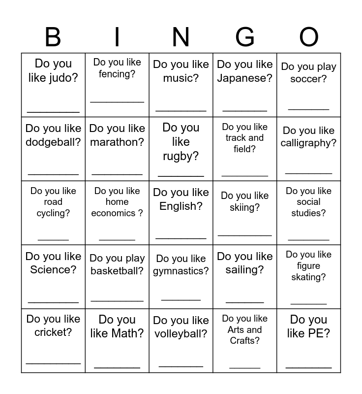 This bingo card has 25 words: Do you play basketball? _________, Do you like volleyball? _______, Do you like rugby? _______, Do you like cricket? _________, Do you play soccer? _______, Do you like judo? ________, Do you like dodgeball? ________, Do you like fencing? __________, Do you like skiing? __________, Do you like gymnastics? _______, Do you like track and field? _________, Do you like road cycling? ______, Do you like sailing? ______, Do you like figure skating? _______, Do you like marathon? ________, Do you like PE? _______, Do you like social studies? ________, Do you like music? ________, Do you like calligraphy? ________, Do you like home economics ? _______, Do you like English? ________, Do you like Math? _______, Do you like Science? ________, Do you like Japanese? _______ and Do you like Arts and Crafts? ______.