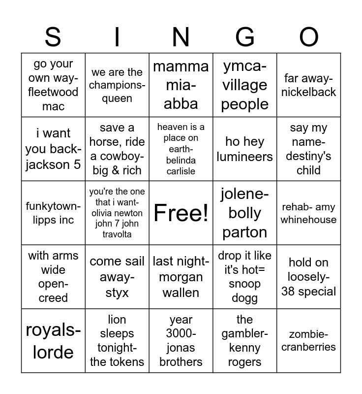 This bingo card has a free space and 59 words: last friday night- katy perry, lion sleeps tonight- the tokens, baby- justin beiber, with arms wide open- creed, the gambler- kenny rogers, before he cheats- carrie underwood, save a horse, ride a cowboy- big & rich, i want it that way- backstreet boys, ho hey lumineers, love story- taylor sweft, ymca- village people, low rider- war, i want you back- jackson 5, use somebody- kings of leon, all summer long- kid rock, go your own way- fleetwood mac, zombie- cranberries, far away- nickelback, iris- goo goo dolls, heaven is a place on earth- belinda carlisle, jolene- bolly parton, mamma mia- abba, royals- lorde, hold on loosely- 38 special, take me home country roads- john denver, who let the dogs out- baha men, don't worry be happy- bobby cmfferrin, who are you- the who, say my name- destiny's child, sugar sugar- archies, believe- cher, california gurls- katy perry, i've had the time of my life- bill medley & jennifer warnes, ring of fire- johnny cash, we are the champions- queen, don't stop believin- journey, seven nation army- white stripes, you're the one that i want- olivia newton john 7 john travolta, no srcubs- tlc, funkytown- lipps inc, any way you want it- journey, come sail away- styx, rehab- amy whinehouse, should is stay or should i go- the clash, take on me- a-ha, are you gonna be my girl- jet, single ladies- beyonce, as long as you love me- justin beiber, last night- morgan wallen, year 3000- jonas brothers, ain't no mountain high enough- marvin gaye, big poppa- biggie, california love- tupac, real slim shady- eminem, ignition (remix)- r kelly, drop it like it's hot= snoop dogg, just the way uou are- bruno mars, lose yourself- eminem and in da club- 50 cent.