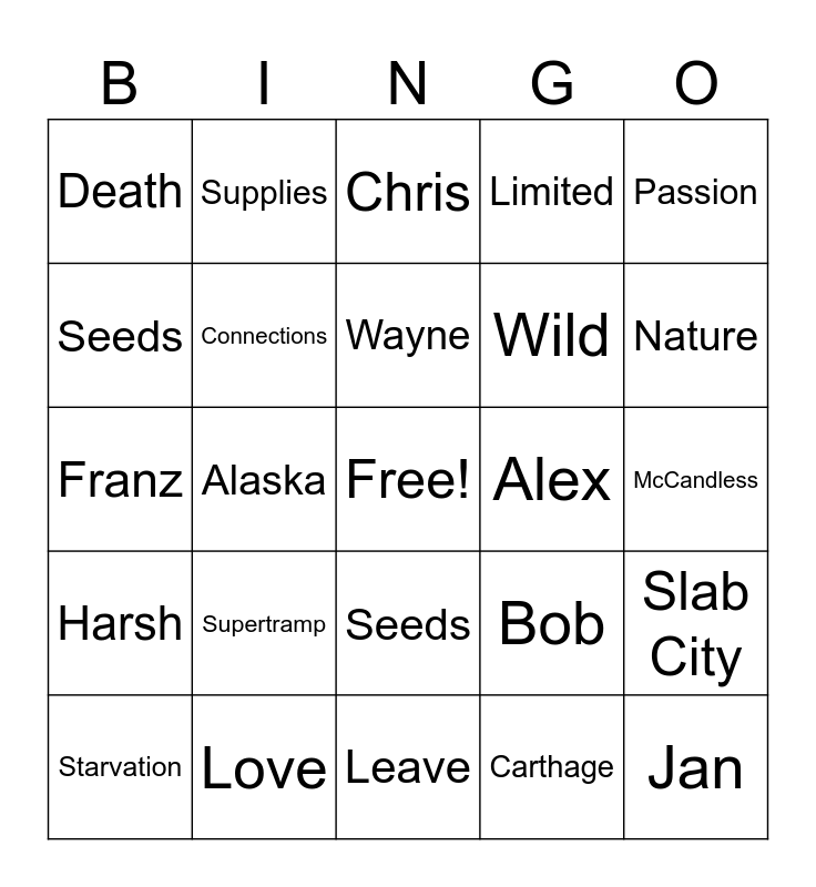 This bingo card has a free space and 24 words: Supertramp, Love, Wayne, Starvation, Passion, Death, Seeds, Supplies, Alex, Seeds, Wild, Franz, Bob, Slab City, Connections, Carthage, McCandless, Chris, Nature, Alaska, Jan, Harsh, Limited and Leave.