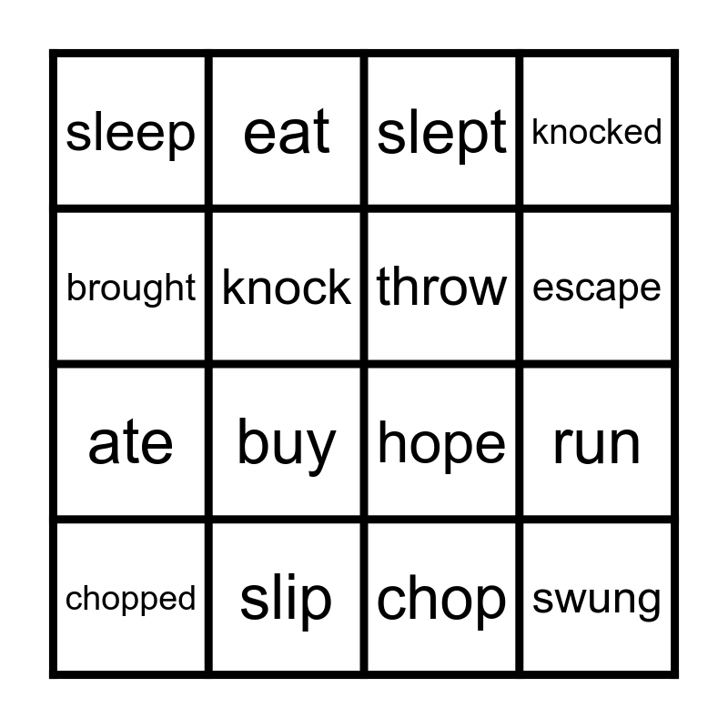 This bingo card has 30 words: catch, caught, run, ran, sleep, slept, throw, threw, slip, slipped, chop, chopped, save, saved, buy, bought, swing, swung, bring, brought, hope, hopped, eat, ate, knock, knocked, push, pushed, escape and escaped.