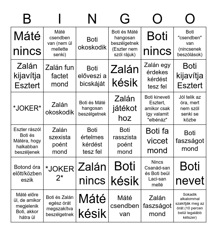 This bingo card has 36 words: Boti késik, Zalán nincs, Máté csendben van, Zalán kijavítja Esztert, Eszter rászól Boti és Mátéra, hogy halkabban beszéljenek, Zalán játékot hoz, Zalán fun factet mond, Máté késik, Boti nincs, Nincs Csanád-san és Boti beül Laci-san mellé, Boti kijavítja Esztert, Boti és Máté hangosan beszélgetnek (Eszter nem szól rájuk), Boti nevet, Zalán okoskodik, Zalán késik, Máté nincs, Botond óra előtt/közben eszik, Boti kineveti Esztert, amikor csak így valamit "elbénáz", *JOKER*, Boti okoskodik, Boti és Máté hangosan beszélgetnek, Zalán szexista poént mond, Boti rasszista poént mond, Boti értelmes kérdést tesz fel, Boti fa viccet mond, Máté csendben van (nem ül mellette senki), Zalán egy érdekes kérdést tesz fel, Boti és Zalán egész órát megszakítva beszélgetnek, Boti előveszi a bicskáját, Boti "csendben" van (nincsenek beszólások), Sokadik alkalommal szakítják meg az órát (10 percen belül legalább kétszer), Máté előre ül, de amikor megjelenik Boti, akkor hátra ül, Boti faszságot mond, Jól telik az óra, mert nem szól senki se közbe, *JOKER 2* and Zalán faszságot mond.
