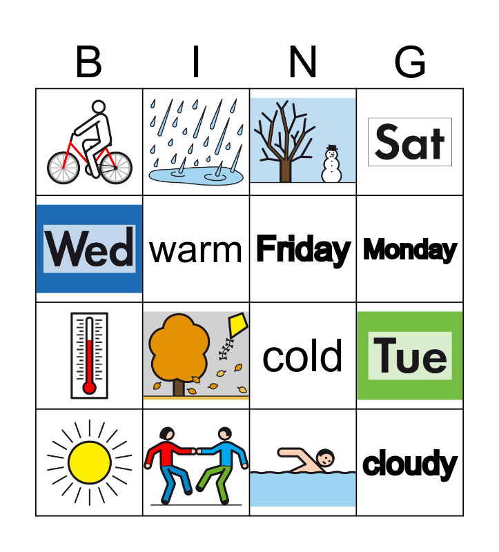 This bingo card has 11 images and 5 words: cold, warm, Monday, Friday and cloudy.