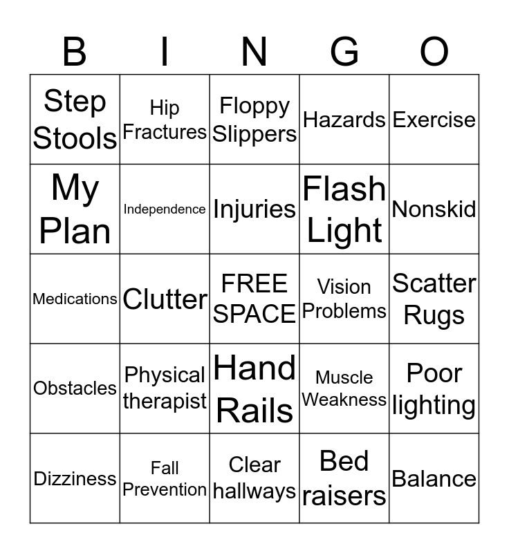 This bingo card has a free space and 24 words: Physical therapist, Fall Prevention, Injuries, Dizziness, Exercise, Step Stools, My Plan, Hip Fractures, Vision Problems, Hand Rails, Flash Light, Medications, Muscle Weakness, Poor lighting, Independence, Bed raisers, Scatter Rugs, Floppy Slippers, Nonskid, Clutter, Balance, Obstacles, Hazards and Clear hallways.