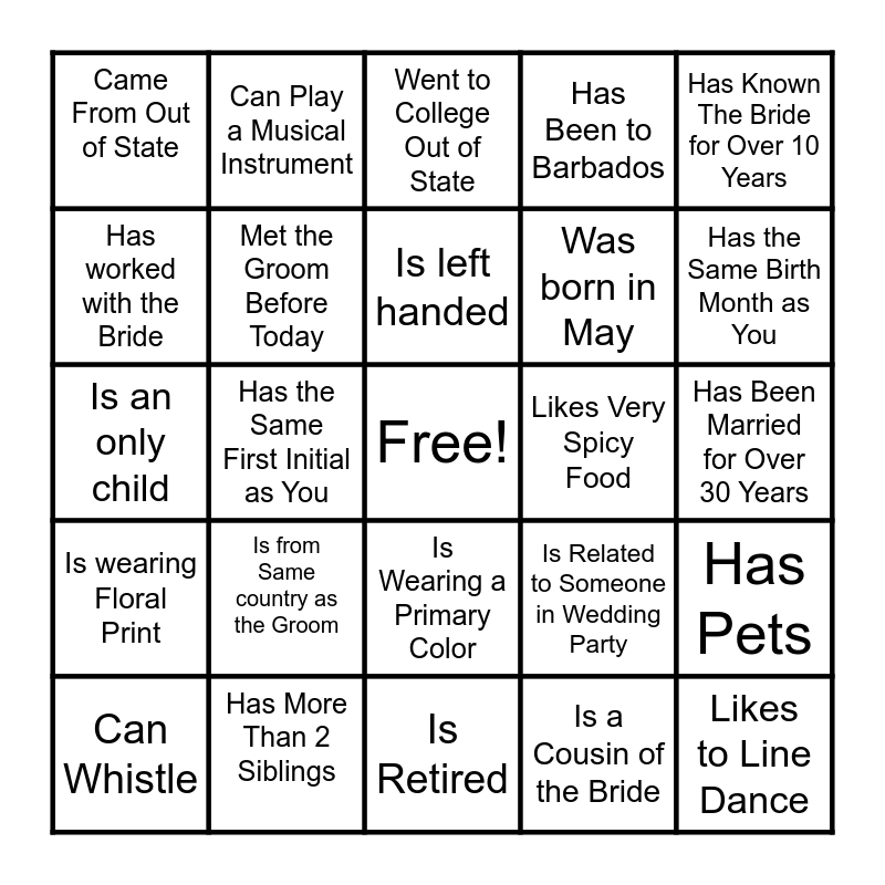 This bingo card has a free space and 24 words: Is from Same country as the Groom, Has More Than 2 Siblings, Is left handed, Can Whistle, Has Known The Bride for Over 10 Years, Came From Out of State, Has worked with the Bride, Can Play a Musical Instrument, Likes Very Spicy Food, Is Wearing a Primary Color, Was born in May, Is an only child, Is Related to Someone in Wedding Party, Has Pets, Met the Groom Before Today, Is a Cousin of the Bride, Has Been Married for Over 30 Years, Went to College Out of State, Has the Same Birth Month as You, Has the Same First Initial as You, Likes to Line Dance, Is wearing Floral Print, Has Been to Barbados and Is Retired.
