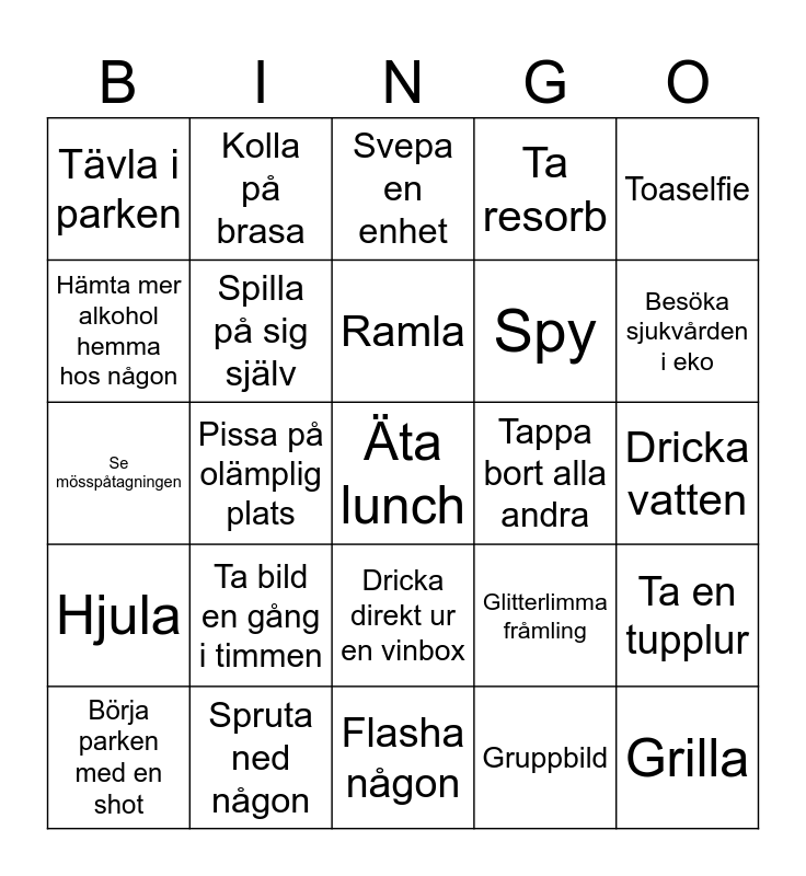 This bingo card has 30 words: Spruta ned någon, Dricka mimosa, Pissa på olämplig plats, Kullerbytta, Tävla i parken, Svepa en enhet, Spilla på sig själv, Dricka direkt ur en vinbox, Tappa bort alla andra, Flasha någon, Dricka vatten, Äta lunch, Gruppbild, Grilla, Besöka sjukvården i eko, Hitta gamla kompisar, Glitterlimma fråmling, Hjula, Ta bild en gång i timmen, Toaselfie, Se mösspåtagningen, Se Allmänna sången, Kolla på brasa, Spy, Hämta mer alkohol hemma hos någon, Ta resorb, Ta en tupplur, Börja parken med en shot, Ramla and Få någon randoms nummer.