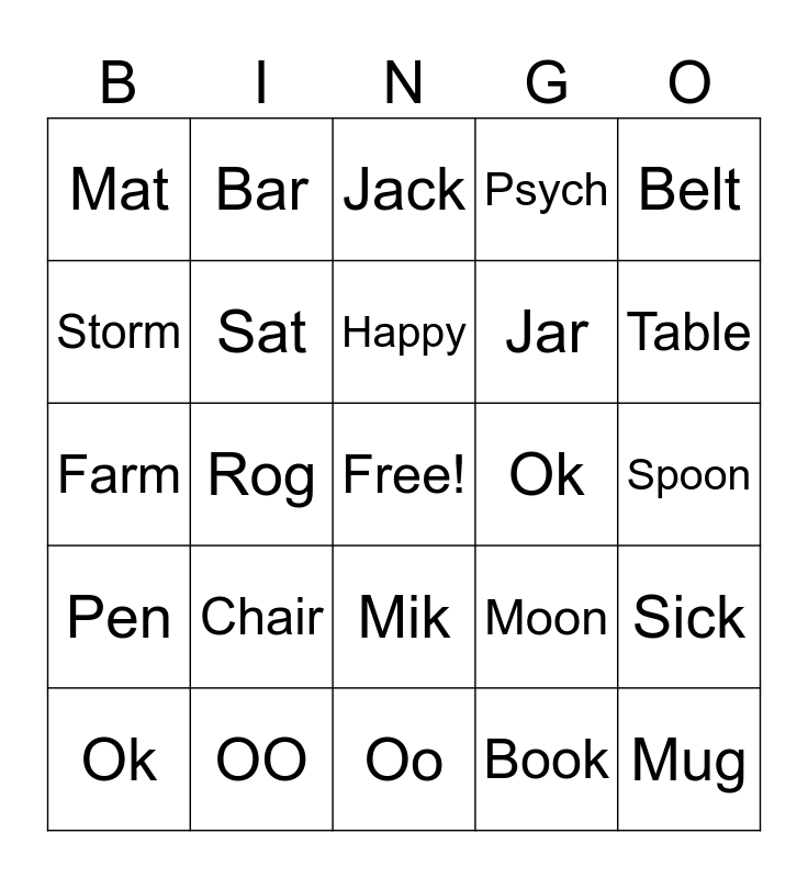 This bingo card has a free space and 30 words: OO, Em, Rog, Rat, Mat, Jack, Sat, Mik, Ok, Oo, Spoon, Mug, Book, Stone, Table, Star, Moon, Pen, Chair, Belt, Farm, Car, Bar, Jar, Storm, Psych, Sick, Ok, Happy and Sad.