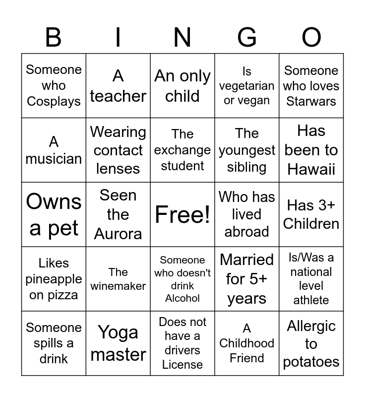 This bingo card has a free space and 24 words: The winemaker, Yoga master, The exchange student, Someone spills a drink, Someone who loves Starwars, Someone who Cosplays, A musician, A teacher, Who has lived abroad, Someone who doesn't drink Alcohol, The youngest sibling, Owns a pet, Married for 5+ years, Is/Was a national level athlete, Wearing contact lenses, A Childhood Friend, Has 3+ Children, An only child, Has been to Hawaii, Seen the Aurora, Allergic to potatoes, Likes pineapple on pizza, Is vegetarian or vegan and Does not have a drivers License.