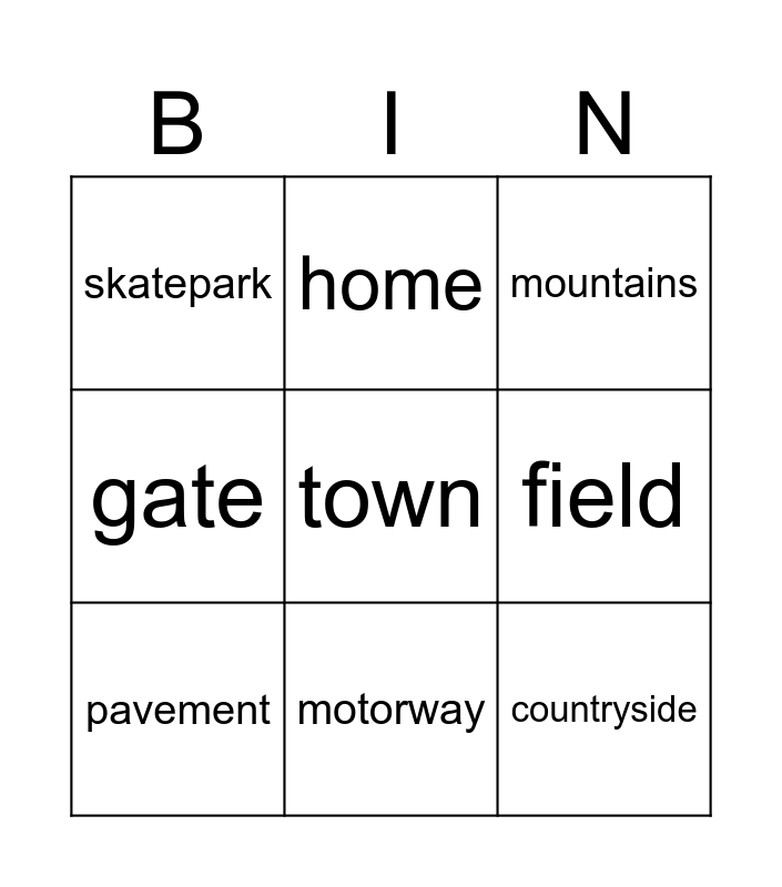 This bingo card has a free space and 20 words: city, forest, mountains, beach, lake, countryside, zoo, skatepark, playground, home, wood, street, field, flats, pavement, shopping centre, motorway, gate, path and farm.