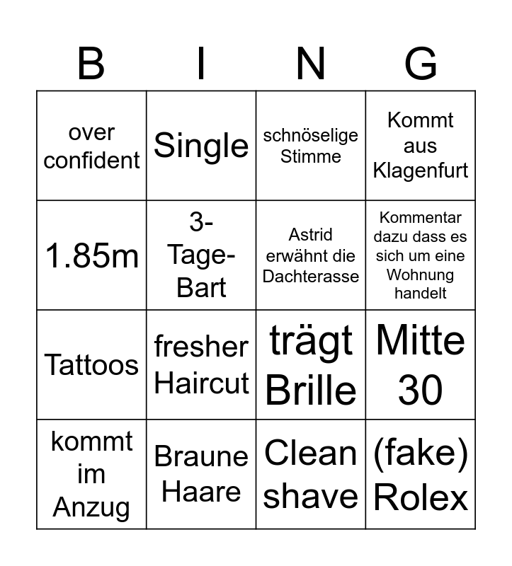 This bingo card has 16 words: Braune Haare, Mitte 30, schnöselige Stimme, over confident, Tattoos, Single, trägt Brille, Clean shave, 1.85m, 3-Tage-Bart, kommt im Anzug, Kommt aus Klagenfurt, fresher Haircut, Kommentar dazu dass es sich um eine Wohnung handelt, Astrid erwähnt die Dachterasse and (fake) Rolex.