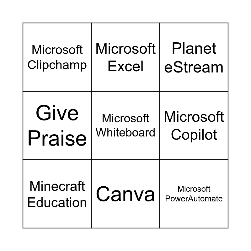 This bingo card has 25 words: Actionbound, Bingo Baker, Canva, Edpuzzle, Microsoft Whiteboard, Microsoft Clipchamp, Microsoft Copilot, Microsoft Excel, Microsoft Forms, Microsoft OneNote, Microsoft PowerAutomate, Microsoft PowerPoint, Microsoft Teams, Microsoft Word, Minecraft Education, Moodle, Padlet, Planet eStream, Quizizz, TeacherMatic, myViewBoard, Wordwall, The Hub, Give Praise and VR.