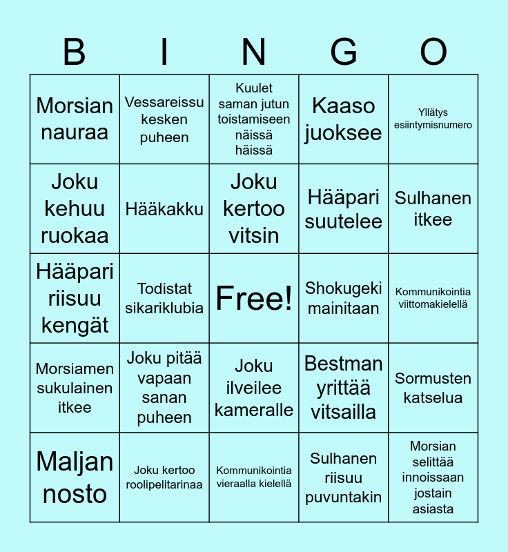 This bingo card has a free space and 30 words: Joku kertoo roolipelitarinaa, Kukkapuska lentää, Todistat sikariklubia, Sulhanen nauraa, Morsian nauraa, Kuulet saman jutun toistamiseen näissä häissä, Hääkakku, Joku ilveilee kameralle, Shokugeki mainitaan, Kommunikointia vieraalla kielellä, Kommunikointia viittomakielellä, Morsian selittää innoissaan jostain asiasta, Sulhanen riisuu puvuntakin, Morsian itkee, Sulhanen itkee, Puheen pitäjä itkee, Bestman yrittää vitsailla, Morsiamen sukulainen itkee, Joku pitää vapaan sanan puheen, Yllätys esiintymisnumero, Hääpari riisuu kengät, Joku rukkaa soittolistaa, Vessareissu kesken puheen, Hääpari suutelee, Joku kehuu ruokaa, Kaaso juoksee, Sormusten katselua, Maljan nosto, Joku kertoo vitsin and Selfie.