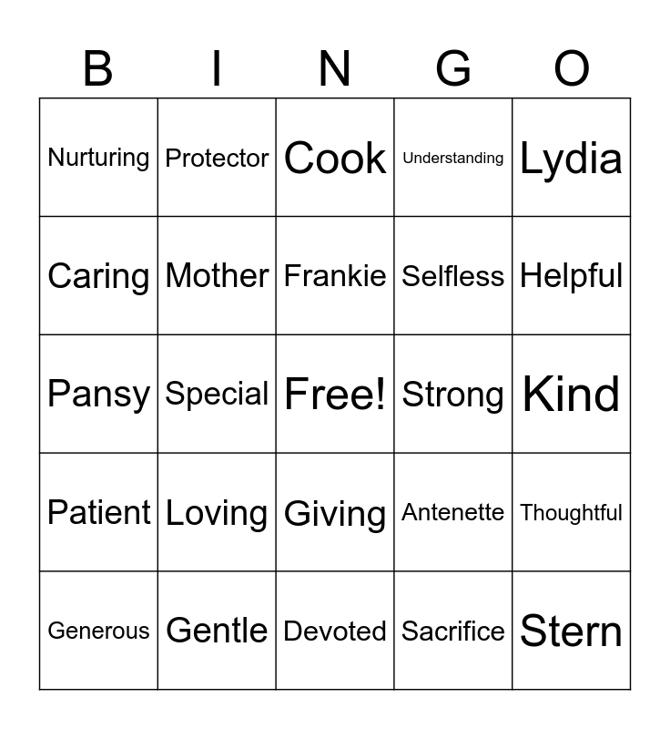 This bingo card has a free space and 24 words: Loving, Gentle, Frankie, Generous, Lydia, Nurturing, Caring, Protector, Strong, Giving, Selfless, Pansy, Antenette, Thoughtful, Mother, Sacrifice, Kind, Cook, Helpful, Special, Stern, Patient, Understanding and Devoted.