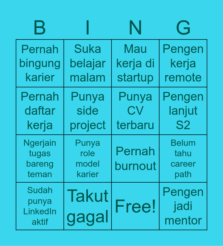 This bingo card has 17 words: Free!, Sudah punya LinkedIn aktif, Mau kerja di startup, Pernah bingung karier, Punya role model karier, Pengen kerja remote, Belum tahu career path, Punya CV terbaru, Pengen lanjut S2, Punya side project, Takut gagal, Pernah burnout, Pernah daftar kerja, Suka belajar malam, Ngerjain tugas bareng teman, Cinlok and Pengen jadi mentor.