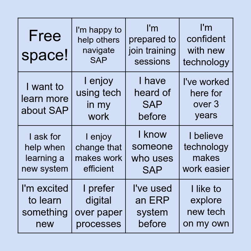 This bingo card has 16 words: I'm excited to learn something new, I prefer digital over paper processes, I'm prepared to join training sessions, I'm confident with new technology, I want to learn more about SAP, I'm happy to help others navigate SAP, I know someone who uses SAP, I believe technology makes work easier, Free space!, I enjoy using tech in my work, I've used an ERP system before, I've worked here for over 3 years, I ask for help when learning a new system, I enjoy change that makes work efficient, I have heard of SAP before and I like to explore new tech on my own.