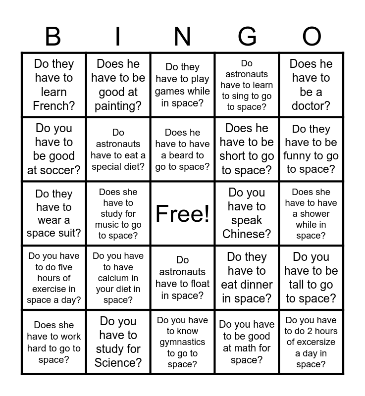This bingo card has a free space and 24 words: Do you have to have calcium in your diet in space?, Do you have to study for Science?, Does he have to have a beard to go to space?, Does she have to work hard to go to space?, Does he have to be a doctor?, Do they have to learn French?, Do you have to be good at soccer?, Does he have to be good at painting?, Do you have to speak Chinese?, Do astronauts have to float in space?, Does he have to be short to go to space?, Do they have to wear a space suit?, Do they have to eat dinner in space?, Do you have to be tall to go to space?, Do astronauts have to eat a special diet?, Do you have to be good at math for space?, Does she have to have a shower while in space?, Do they have to play games while in space?, Do they have to be funny to go to space?, Does she have to study for music to go to space?, Do you have to do 2 hours of excersize a day in space?, Do you have to do five hours of exercise in space a day?, Do astronauts have to learn to sing to go to space? and Do you have to know gymnastics to go to space?.