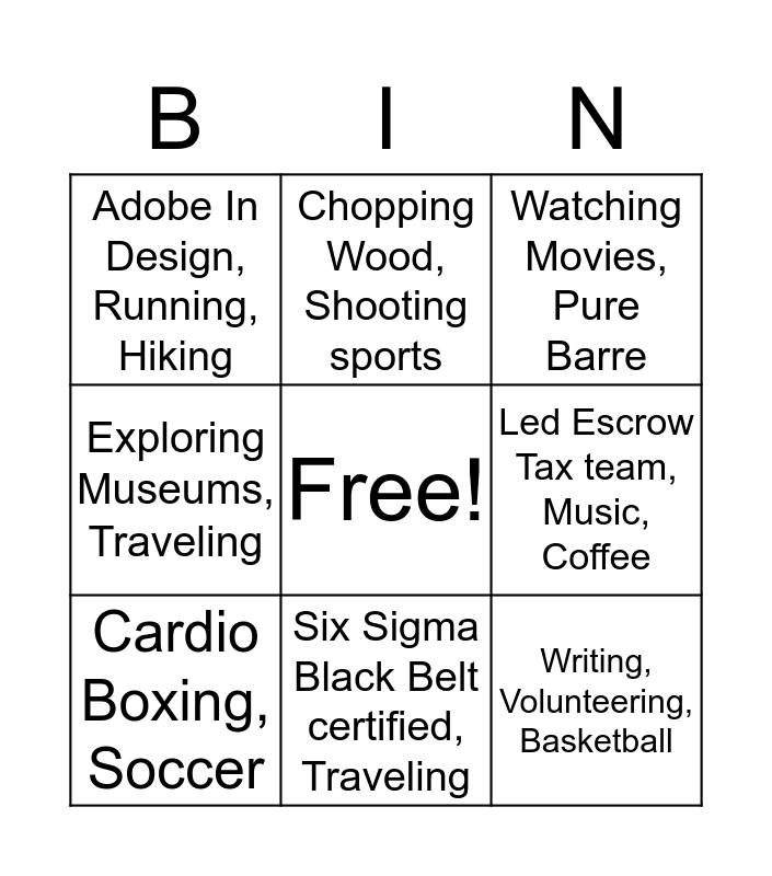 This bingo card has a free space and 8 words: Led Escrow Tax team, Music, Coffee, Watching Movies, Pure Barre, Chopping Wood, Shooting sports, Cardio Boxing, Soccer, Adobe In Design, Running, Hiking, Writing, Volunteering, Basketball, Exploring Museums, Traveling and Six Sigma Black Belt certified, Traveling.