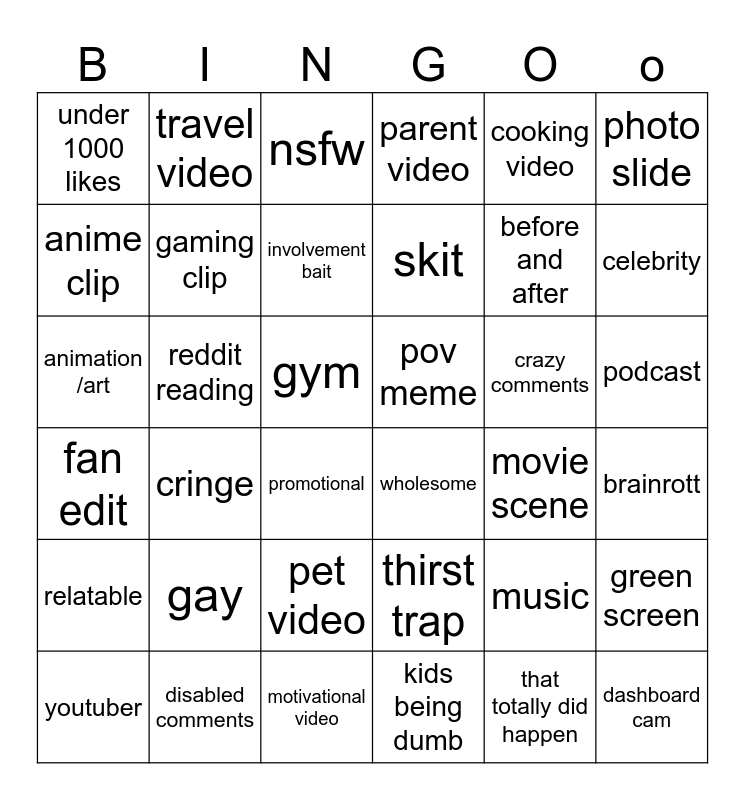 This bingo card has 36 words: thirst trap, pet video, kids being dumb, anime clip, fan edit, pov meme, gaming clip, motivational video, cooking video, music, celebrity, parent video, green screen, reddit reading, skit, under 1000 likes, relatable, crazy comments, animation /art, nsfw, gym, cringe, wholesome, promotional, movie scene, travel video, before and after, disabled comments, involvement bait, photo slide, dashboard cam, youtuber, brainrott, podcast, gay and that totally did happen.