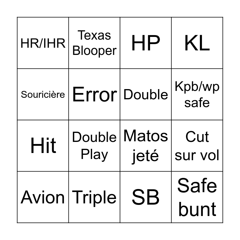 This bingo card has 19 words: Matos jeté, "Où est la balle de match ?", HP, Safe bunt, Cut sur vol, Souricière, SB, HR/IHR, Texas Blooper, Hit, Double Play, Error, Double, Triple, Avion, KS, KL, Kpb/wp safe and Bad call from Ump.