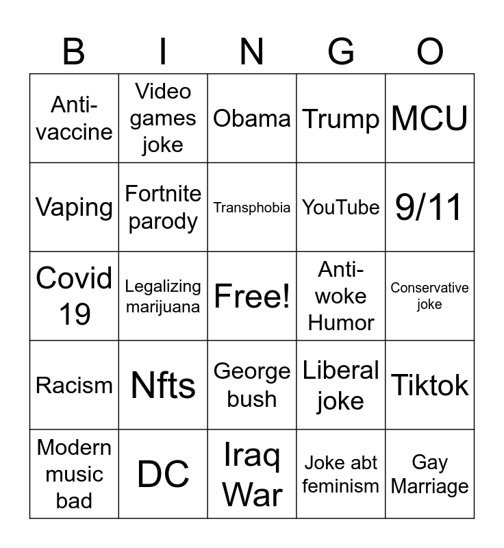 This bingo card has a free space and 24 words: Nfts, DC, Transphobia, Modern music bad, MCU, Anti-vaccine, Vaping, Video games joke, Anti-woke Humor, George bush, YouTube, Covid 19, Liberal joke, Tiktok, Fortnite parody, Joke abt feminism, Conservative joke, Obama, 9/11, Legalizing marijuana, Gay Marriage, Racism, Trump and Iraq War.