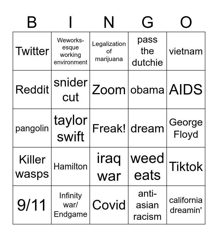 This bingo card has a free space and 24 words: Hamilton, Infinity war/ Endgame, Zoom, 9/11, vietnam, Twitter, Reddit, Weworks-esque working environment, dream, iraq war, obama, pangolin, weed eats, Tiktok, snider cut, anti-asian racism, George Floyd, Legalization of marijuana, AIDS, taylor swift, california dreamin', Killer wasps, pass the dutchie and Covid.