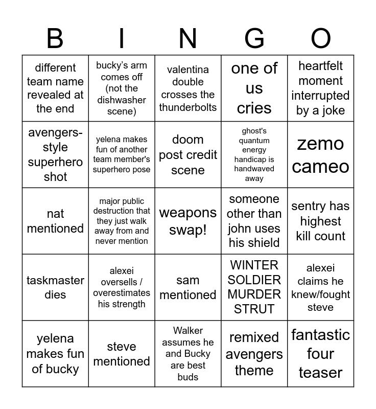 This bingo card has a free space and 24 words: alexei oversells / overestimates his strength, steve mentioned, doom post credit scene, yelena makes fun of bucky, heartfelt moment interrupted by a joke, different team name revealed at the end, avengers-style superhero shot, bucky’s arm comes off (not the dishwasher scene), someone other than john uses his shield, sam mentioned, ghost's quantum energy handicap is handwaved away, nat mentioned, WINTER SOLDIER MURDER STRUT, alexei claims he knew/fought steve, yelena makes fun of another team member's superhero pose, remixed avengers theme, sentry has highest kill count, valentina double crosses the thunderbolts, zemo cameo, major public destruction that they just walk away from and never mention, fantastic four teaser, taskmaster dies, one of us cries and Walker assumes he and Bucky are best buds.