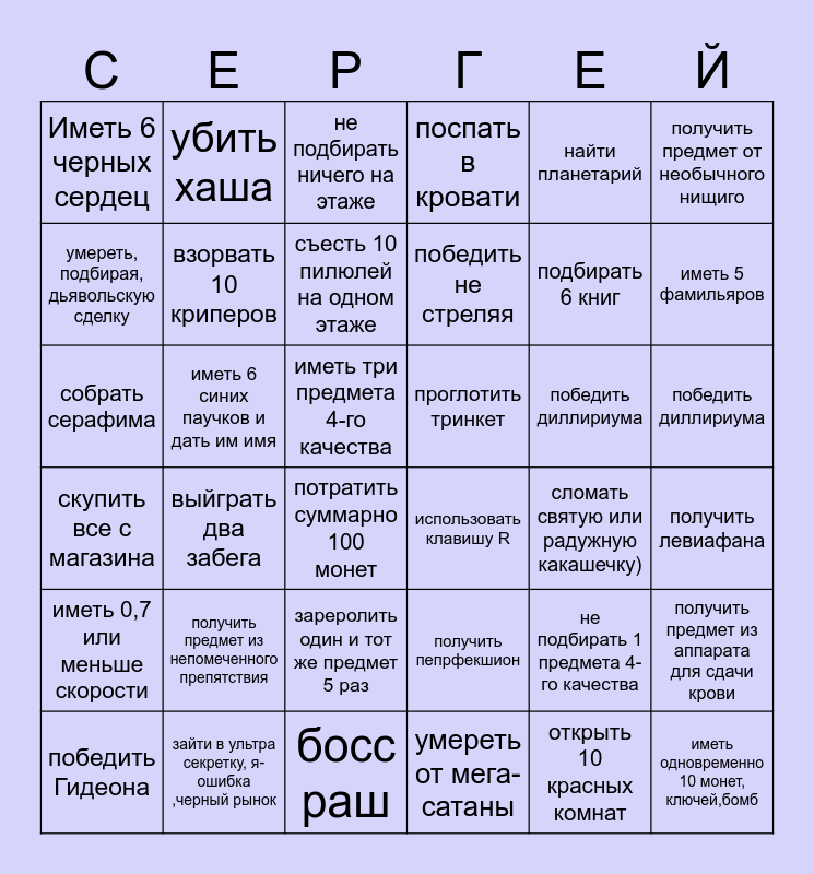 This bingo card has 36 words: скупить все с магазина, выйграть два забега, босс раш, победить не стреляя, победить диллириума, победить диллириума, Иметь 6 черных сердец, зайти в ультра секретку, я-ошибка ,черный рынок, не подбирать ничего на этаже, получить пепрфекшион, подбирать 6 книг, получить предмет от необычного нищиго, иметь 0,7 или меньше скорости, иметь 6 синих паучков и дать им имя, съесть 10 пилюлей на одном этаже, поспать в кровати, не подбирать 1 предмета 4-го качества, получить левиафана, умереть, подбирая, дьявольскую сделку, взорвать 10 криперов, потратить суммарно 100 монет, использовать клавишу R, сломать святую или радужную какашечку), получить предмет из аппарата для сдачи крови, собрать серафима, убить хаша, иметь три предмета 4-го качества, умереть от мега-сатаны, найти планетарий, иметь 5 фамильяров, победить Гидеона, получить предмет из непомеченного препятствия, зареролить один и тот же предмет 5 раз, проглотить тринкет, открыть 10 красных комнат and иметь одновременно 10 монет, ключей,бомб.