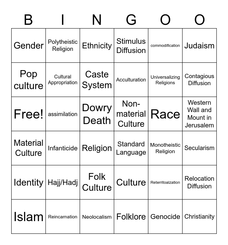 This bingo card has 36 words: Culture, Folk Culture, Folklore, Pop culture, Material Culture, Non-material Culture, Cultural Appropriation, Neolocalism, commodification, Reterritoalzation, Contagious Diffusion, Stimulus Diffusion, Relocation Diffusion, assimilation, Acculturation, Gender, Identity, Race, Free!, Ethnicity, Dowry Death, Infanticide, Standard Language, Religion, Monotheistic Religion, Polytheistic Religion, Universalizing Religions, Reincarnation, Caste System, Judaism, Christianity, Islam, Secularism, Western Wall and Mount in Jerusalem, Hajj/Hadj and Genocide.