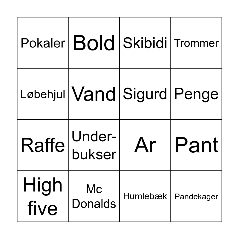 This bingo card has 20 words: Pant, Vitser, Skibidi, Bade & shoppe, High five, Løbehjul, Mc Donalds, Pokaler, Raffe, Bold, Under-bukser, Ar, Vand, Pandekager, Sigurd, Trampolin, Penge, Trommer, Humlebæk and Japansk sodavand.