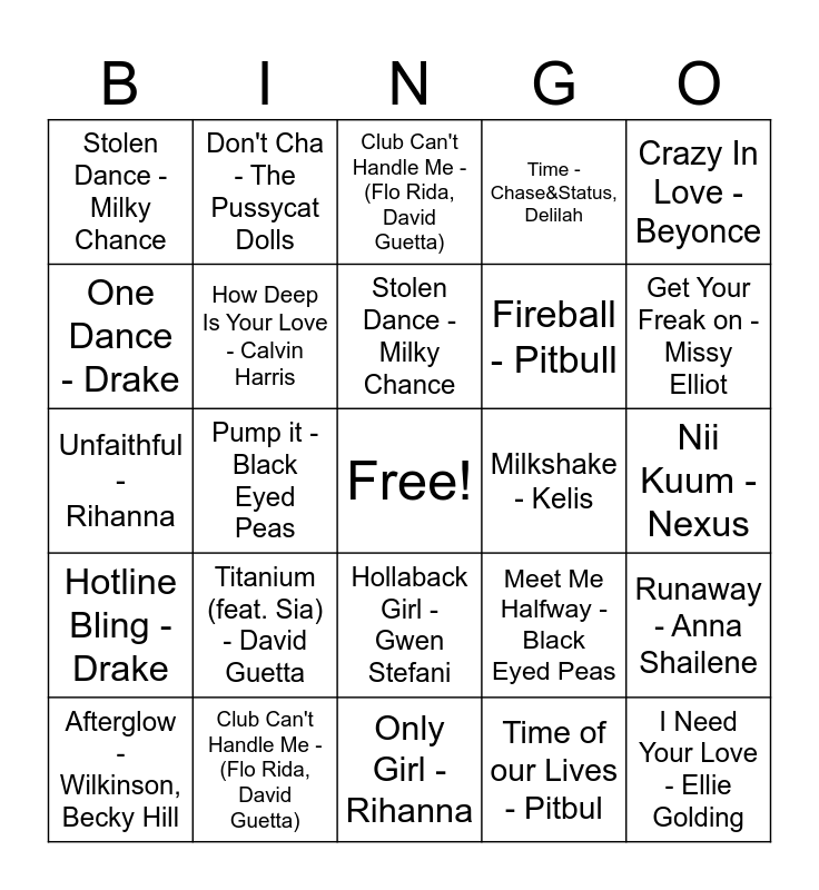 This bingo card has a free space and 24 words: Titanium (feat. Sia) - David Guetta, Club Can't Handle Me -(Flo Rida, David Guetta), Stolen Dance - Milky Chance, Afterglow - Wilkinson, Becky Hill, Crazy In Love - Beyonce, Stolen Dance - Milky Chance, One Dance - Drake, Don't Cha - The Pussycat Dolls, Milkshake - Kelis, Hollaback Girl - Gwen Stefani, Fireball - Pitbull, Unfaithful - Rihanna, Meet Me Halfway - Black Eyed Peas, Runaway - Anna Shailene, How Deep Is Your Love - Calvin Harris, Time of our Lives - Pitbul, Nii Kuum - Nexus, Club Can't Handle Me - (Flo Rida, David Guetta), Get Your Freak on - Missy Elliot, Pump it - Black Eyed Peas, I Need Your Love - Ellie Golding, Hotline Bling - Drake, Time - Chase&Status, Delilah and Only Girl - Rihanna.
