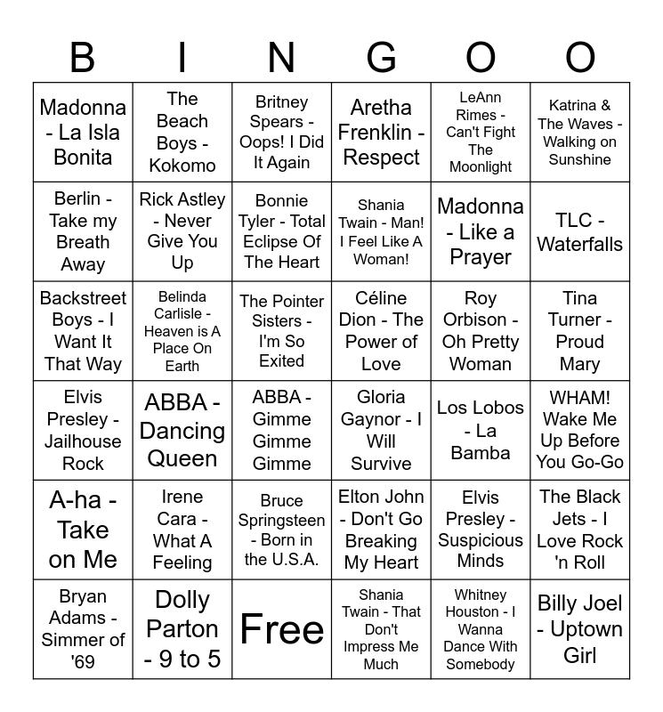 This bingo card has 40 words: Free, Madonna - Like a Prayer, The Pointer Sisters - Fire, Berlin - Take my Breath Away, Gloria Gaynor - I Will Survive, Tina Turner - Proud Mary, Rick Astley - Never Give You Up, Ciny Lauper - Girls Just Want To Have Fun, LeAnn Rimes - Can't Fight The Moonlight, Céline Dion - The Power of Love, TLC - Waterfalls, Aretha Frenklin - Respect, Backstreet Boys - I Want It That Way, The Pointer Sisters - I'm So Exited, Belinda Carlisle - Heaven is A Place On Earth, Roy Orbison - Oh Pretty Woman, The Black Jets - I Love Rock 'n Roll, Madonna - La Isla Bonita, Shania Twain - That Don't Impress Me Much, Britney Spears - Oops! I Did It Again, ABBA - Dancing Queen, WHAM! Wake Me Up Before You Go-Go, Bonnie Tyler - Total Eclipse Of The Heart, Katrina & The Waves - Walking on Sunshine, Whitney Houston - I Wanna Dance With Somebody, Elton John - Don't Go Breaking My Heart, Irene Cara - What A Feeling, Billy Joel - Uptown Girl, A-ha - Take on Me, Bruce Springsteen - Born in the U.S.A., Bon Jovi - Livin' On a Prayer, ABBA - Gimme Gimme Gimme, Bryan Adams - Simmer of '69, Elvis Presley - Jailhouse Rock, Shania Twain - Man! I Feel Like A Woman!, Los Lobos - La Bamba, Elvis Presley - Suspicious Minds, Dolly Parton - 9 to 5, The Beach Boys - Kokomo and The Monkees - I'm a Believer.