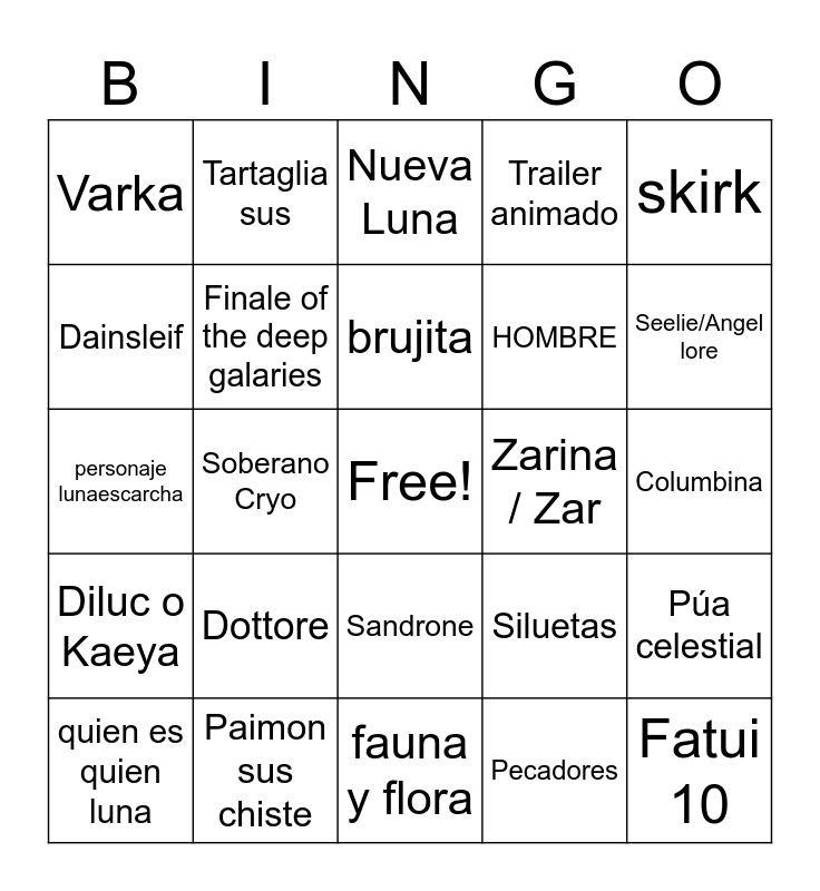 This bingo card has a free space and 24 words: Dottore, Paimon sus chiste, brujita, quien es quien luna, skirk, Varka, Dainsleif, Tartaglia sus, Zarina / Zar, Sandrone, HOMBRE, personaje lunaescarcha, Siluetas, Púa celestial, Finale of the deep galaries, Pecadores, Columbina, Nueva Luna, Seelie/Angel lore, Soberano Cryo, Fatui 10, Diluc o Kaeya, Trailer animado and fauna y flora.