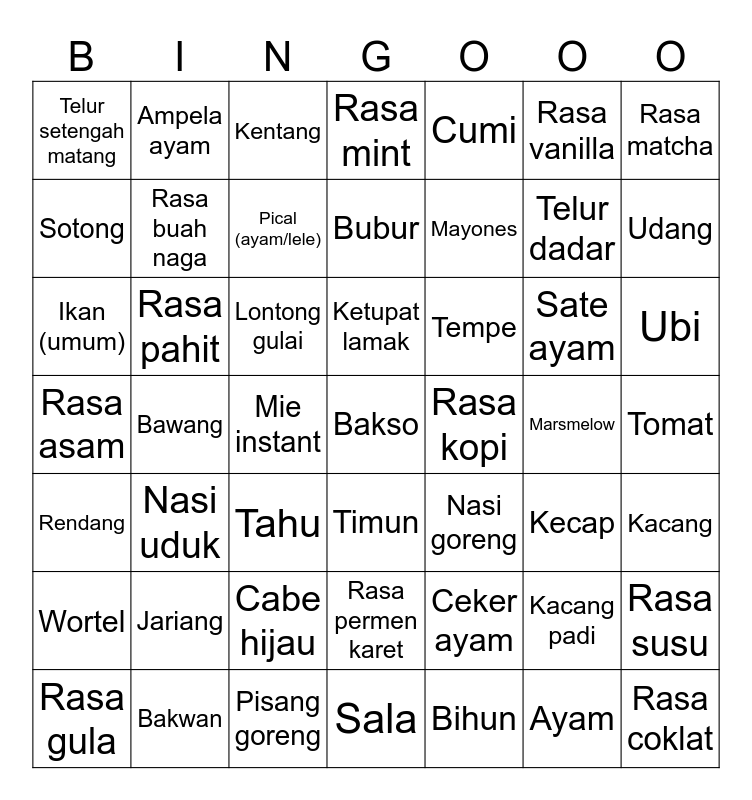This bingo card has a free space and 62 words: Rasa manis, Rasa asam, Rasa asin, Rasa pahit, Rasa coklat, Rasa susu, Rasa matcha, Rasa alpukat, Rasa buah naga, Rasa gula, Rasa mint, Rasa permen karet, Rasa vanilla, Rasa kopi, Telur mata sapi, Telur setengah matang, Telur dadar, Cumi, Gurita, Sotong, Udang, Kentang, Ubi, Mie instant, Mie ayam, Nasi goreng, Nasi uduk, Sate sapi, Sate ayam, Kacang, Cabe merah, Cabe hijau, Ayam, Ikan teri, Ikan (umum), Ampela ayam, Ceker ayam, Kecap, Mayones, Marsmelow, Bubur, Kacang padi, Lontong gulai, Gado-gado, Pical (ayam/lele), Tempe, Tahu, Bakwan, Sala, Bihun, Ketupat lamak, Bawang, Petai, Jariang, Terong, Tomat, Timun, Wortel, Pisang goreng, Kerupuk, Rendang and Kambing.