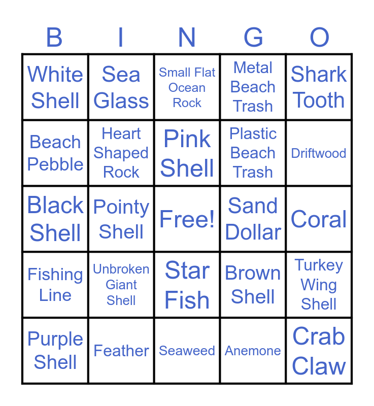 This bingo card has a free space and 25 words: Unbroken Giant Shell, Seaweed, Pink Shell, Purple Shell, Shark Tooth, White Shell, Beach Pebble, Sea Glass, Sand Dollar, Star Fish, Plastic Beach Trash, Black Shell, Brown Shell, Turkey Wing Shell, Heart Shaped Rock, Freepace, Coral, Small Flat Ocean Rock, Driftwood, Pointy Shell, Crab Claw, Feather, Fishing Line, Metal Beach Trash and Anemone.