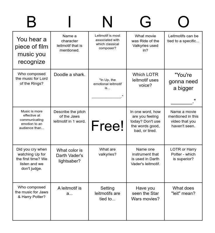 This bingo card has a free space and 24 words: What color is Darth Vader's lightsaber?, A leitmotif is a..., "In Up, the emotional leitmotif is... _______________.", Who composed the music for Jaws & Harry Potter?, Leitmotifs can be tied to a specific..., You hear a piece of film music you recognize, Who composed the music for Lord of the Rings?, Name a character leitmotif that is mentioned., In one word, how are you feeling today? Don't use the words good, bad, or tired., What are valkyries?, Which LOTR leitmotif uses voice?, Music is more effective at communicating emotion to an audience than..., Name one instrument that is used in Darth Vader's leitmotif., LOTR or Harry Potter - which is superior?, Doodle a shark., Have you seen the Star Wars movies?, Name a movie mentioned in this video that you haven't seen., Leitmotif is most associated with which classical composer?, "You're gonna need a bigger _______.", Describe the pitch of the Jaws leitmotif in 1 word., What does "leit" mean?, Did you cry when watching Up for the first time? We listen and we don't judge., What movie was Ride of the Valkyries used in? and Setting leitmotifs are tied to....