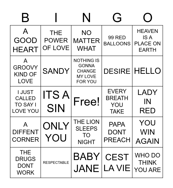 This bingo card has a free space and 44 words: 2 BECOME 1, WHO DO THINK YOU ARE, I BELIEVE I CAN FLY, THE DRUGS DONT WORK, PERFECT DAY, CEST LA VIE, NO MATTER WHAT, BELIEVE, HEAVEN IS A PLACE ON EARTH, RESPECTABLE, 99 RED BALLOONS, EVERY BREATH YOU TAKE, THE LION SLEEPS TO NIGHT, ONLY YOU, YOU CANT HURRY LOVE, BABY JANE, WHERE I LAY MY HAT, I JUST CALLED TO SAY I LOVE YOU, I SHOULD HAVE KNOWN BETTER, HELLO, THE POWER OF LOVE, SAVING ALL MY LOVE FOR YOU, YOU NEVER WALK ALONE, A GOOD HEART, WE ARE THE WORLD, LADY IN RED, SPIRIT IN THE SKY, I WANT TO WAKE UP WITH YOU, PAPA DONT PREACH, A DIFFENT CORNER, LET IT BE, YOU WIN AGAIN, ALWAYS ON MY MIND, I WANNA DANCE WITH SOMEBODY, ITS A SIN, EVERYTHING I OWN, I SHOULD BE SO LUCKY, THE ONLY WAY IS UP, NOTHING IS GONNA CHANGE MY LOVE FOR YOU, A GROOVY KIND OF LOVE, DESIRE, ONE MOMENT IN TIME, SANDY and REHAB.