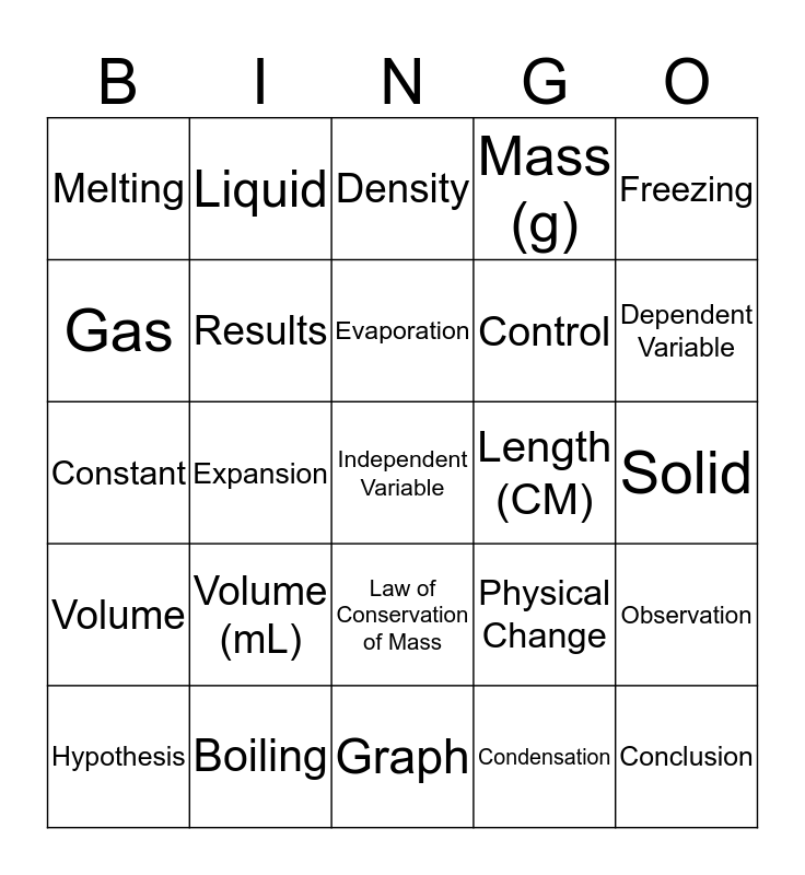 This bingo card has 26 words: Law of Conservation of Mass, Condensation, Evaporation, Boiling, Freezing, Melting, Gas, Liquid, Solid, Physical Change, Control, Constant, Observation, Hypothesis, Expansion, Contraction, Mass (g), Volume, Density, Independent Variable, Dependent Variable, Graph, Length (CM), Volume (mL), Results and Conclusion.