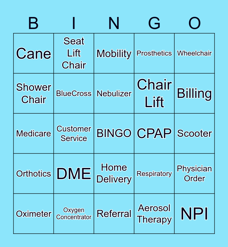 This bingo card has a free space and 24 words: DME, Oxygen Concentrator, Nebulizer, Oximeter, Wheelchair, Cane, Shower Chair, Seat Lift Chair, CPAP, Home Delivery, Chair Lift, Medicare, Respiratory, Physician Order, BlueCross, Aerosol Therapy, Scooter, Mobility, Billing, Customer Service, NPI, Orthotics, Prosthetics and Referral.