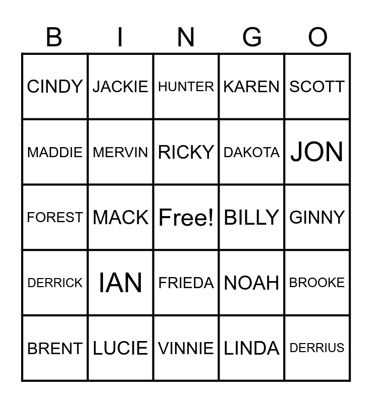 This bingo card has a free space and 29 words: BRENT, SETH, MACK, DEREK, CINDY, HUNTER, MERVIN, IAN, BILLY, LUCIE, GINNY, DERRIUS, VINNIE, LINDA, JON, GARRARD, FRIEDA, DERRICK, SCOTT, FOREST, NOAH, ELLEN, DAKOTA, MADDIE, KAREN, JACKIE, BROOKE, RICKY and BRIAN.