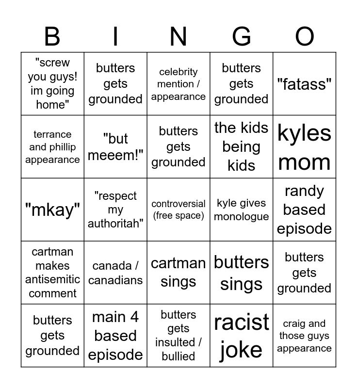 This bingo card has a free space and 29 words: butters gets grounded, kenny dies/ is dead, "respect my authoritah", chef sings, "screw you guys! im going home", celebrity mention / appearance, "but meeem!", canada / canadians, kyle gives monologue, main 4 based episode, randy based episode, craig and those guys appearance, butters gets insulted / bullied, racist joke, kyles mom, "they took er jerbs!", cartman sings, cartman makes antisemitic comment, "fatass", "mkay", butters sings, towelie, the kids being kids, terrance and phillip appearance, butters gets grounded, butters gets grounded, butters gets grounded, butters gets grounded and butters gets grounded.