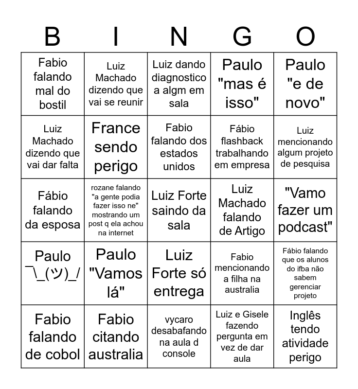 This bingo card has a free space and 24 words: Paulo "Vamos lá", Fabio citando australia, Fabio falando dos estados unidos, Fabio falando de cobol, Paulo "e de novo", Fabio falando mal do bostil, Luiz Machado dizendo que vai dar falta, Luiz Machado dizendo que vai se reunir, Luiz Machado falando de Artigo, Luiz Forte só entrega, Fábio flashback trabalhando em empresa, Fábio falando da esposa, Fabio mencionando a filha na australia, Fábio falando que os alunos do ifba não sabem gerenciar projeto, France sendo perigo, Luiz e Gisele fazendo pergunta em vez de dar aula, "Vamo fazer um podcast", Luiz dando diagnostico a algm em sala, Luiz mencionando algum projeto de pesquisa, rozane falando "a gente podia fazer isso ne" mostrando um post q ela achou na internet, Inglês tendo atividade perigo, Paulo ¯\_(ツ)_/, Paulo "mas é isso" and vycaro desabafando na aula d console.