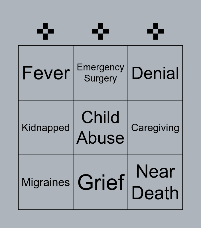This bingo card has 9 words: Migraines, Denial, Emergency Surgery, Kidnapped, Fever, Caregiving, Child Abuse, Near Death and Grief.