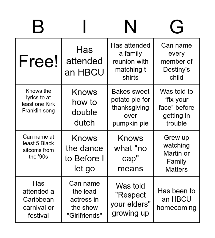 This bingo card has 19 words: Has attended a Caribbean carnival or festival, Knows the debate about which country has the best jollof rice, Has attended a family reunion with matching t shirts, Grew up watching Martin or Family Matters, Is a member of the Divine 9, Has attended an HBCU, Was told "Respect your elders" growing up, Can name every member of Destiny's child, Free!, Knows the dance to Before I let go, Bakes sweet potato pie for thanksgiving over pumpkin pie, Was told to “fix your face” before getting in trouble, Can name at least 5 Black sitcoms from the ’90s, Can name the lead actress in the show "Girlfriends", Knows what "no cap" means, Has been to an HBCU homecoming, Knows the lyrics to at least one Kirk Franklin song, Knows how to double dutch and Can name at least 3 natural hair product brands.