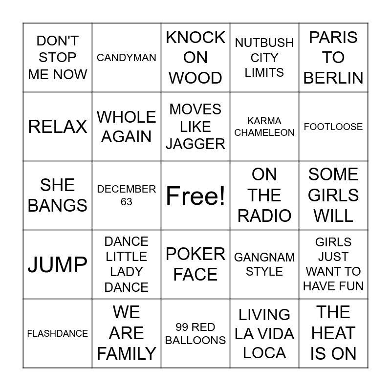 This bingo card has a free space and 45 words: PLAY THAT FUNKY MUSIC, THE HEAT IS ON, LADIES NIGHT, FLASHDANCE, RHYTHM OF THE NIGHT, LIVING LA VIDA LOCA, KNOCK ON WOOD, VALERIE, PARIS TO BERLIN, WE ARE FAMILY, NUTBUSH CITY LIMITS, ON THE RADIO, POKER FACE, DANCE LITTLE LADY DANCE, SKY HIGH, 99 RED BALLOONS, I'M SO EXCITED, SHE BANGS, I LOVE TO BOOGIE, FOOTLOOSE, CANDYMAN, UPTOWN GIRL, ENOUGH IS ENOUGH, DON'T STOP ME NOW, MANEATER, SOME GIRLS WILL, REACH, MAGIC, GANGNAM STYLE, JUMP, WALK LIKE AN EGYPTIAN, GIRLS JUST WANT TO HAVE FUN, IT'S RAINING MEN, CHAIN REACTION, WALKING ON SUNSHINE, DECEMBER 63, BLAME IT ON THE BOOGIE, I'M TO SEXY, HOT STUFF, MOVES LIKE JAGGER, RELAX, KARMA CHAMELEON, TRAGEDY, WHOLE AGAIN and TAINTED LOVE.